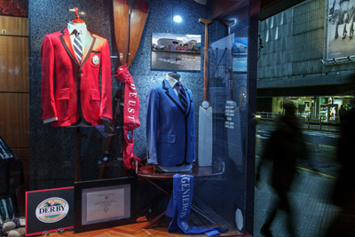 Escaparate en el que destacan las chaquetas, Azul para Ingenieros y Roja para Deusto , que Derby Gardeazabal confecciona y obsequia , desde el pasado año 2015, a los representantes de los centros contendientes , Escuela de Ingeniería de Bilbao y Universidad de Deusto, junto con las Bandas bordadas distintivas de los respectivos 'Padrinos del Desafío', y el 'Remo del Desafío', originario de las islas de Polinesia, que siguiendo la secular tradición arrantzale se arroja al agua, en este caso la alfombra del Hotel Carlton, donde está depositada y permanentemente expuesta la Banda de Plata de la Regata que se pone en juego, para simbolizar el lanzamiento y la aceptación del reto.